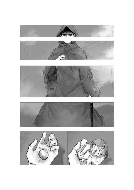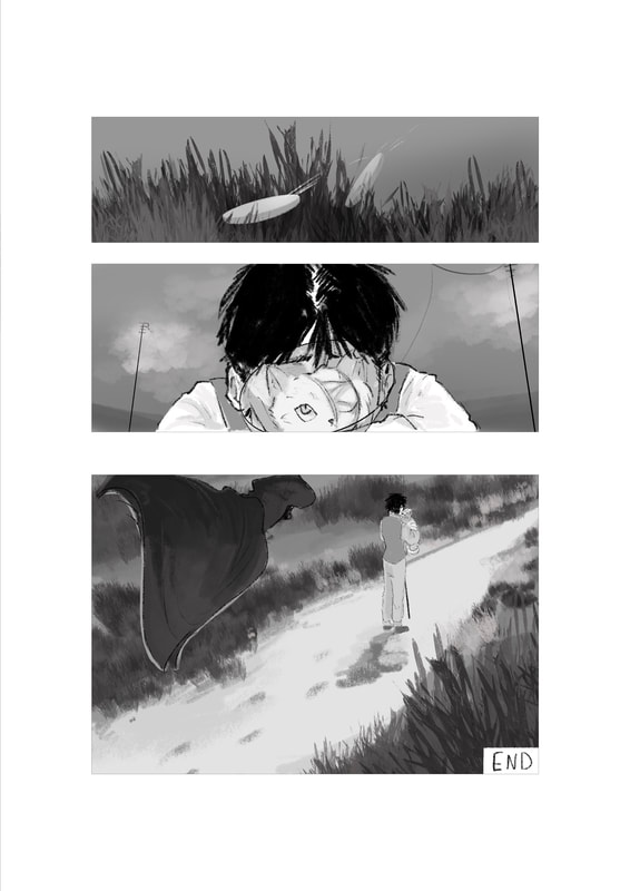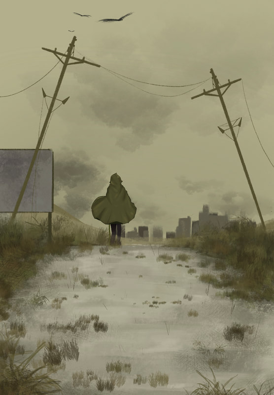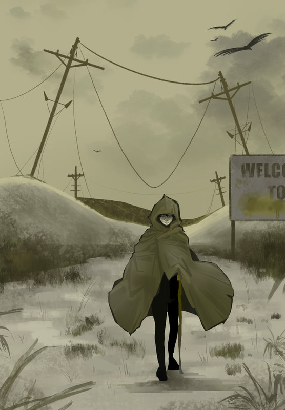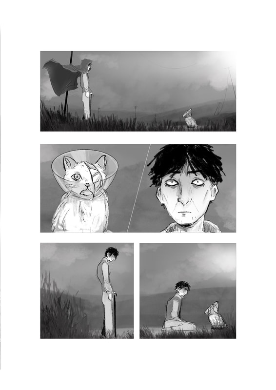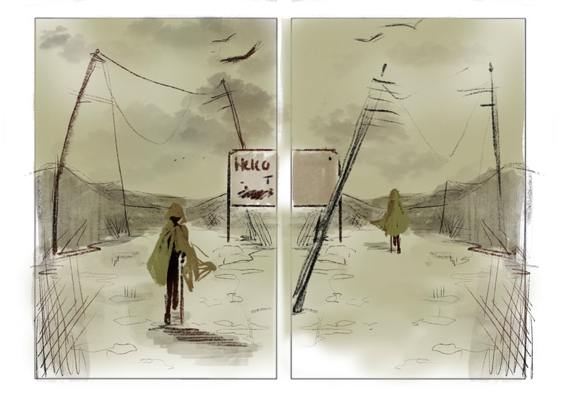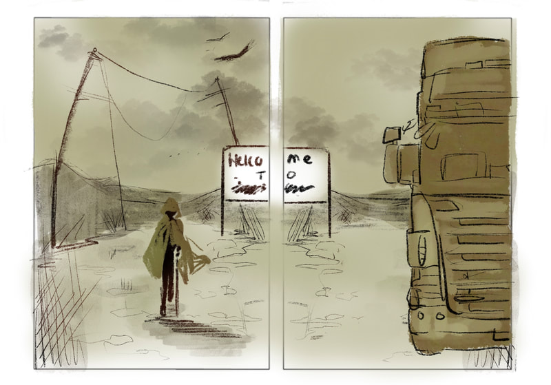 First draft was a greyscale version as we hadn’t decided on a good colour palette for it yet, in the end I chose to make my panels the colours represented in common wasteland / apocalyptic aesthetics.