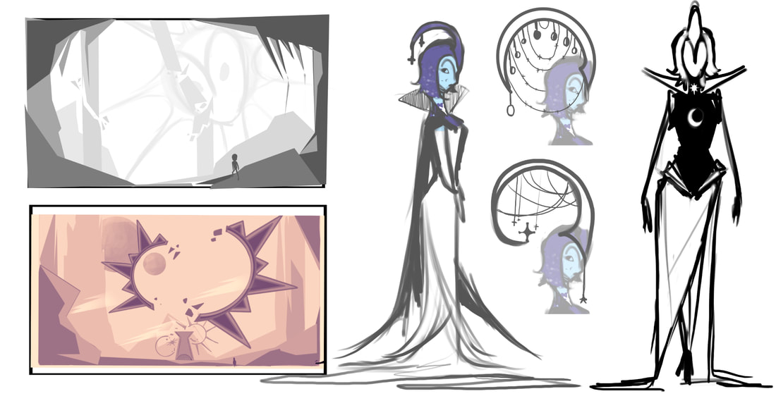 The plan during these designs of the Sun and Moon was to create four stages. Inspired by the sprites work from Hades and No Straight Roads, I wanted to create similar sprites myself that would appear during the interactions between the protagonist and these characters.