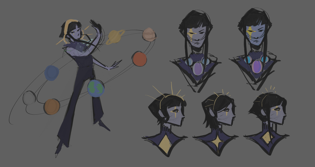 One of the first sketches I did while brainstorming was what I visioned as the protagonist and their companion. Keeping them space theme I created the young girl to be similar to a star to possibly introduce the idea of using her to solve puzzles throughout the game.