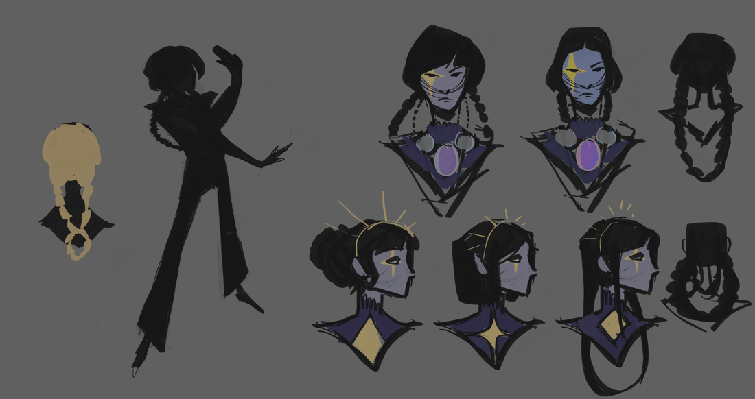 One of if not my biggest inspiration from this project comes from both Hades games. They’re a rouge-like dungeon crawler set around Greek mythology. The most captivating part about is to me is its sprites, portraits specially designed for each character you interact with. Recently I got the chance to try out their sequel and noticed that there is a difference in the designs between characters who are aware of the protagonists existence, black and silver featured with moon crescents for those are and the usual gold and sunny lighting for those not.